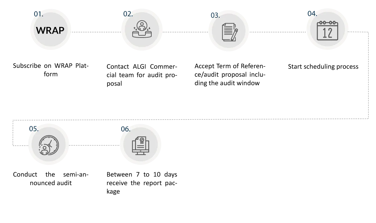 Attaining a WRAP certification involves a 5-step process. It begins with the production facility filing an initial application with WRAP and paying the registration fee. Then the facility will conduct a pre-audit self-assessment of its compliance with WRAP’s 12 Principles, which is followed by an additional audit conducted by ALGI, as one of the accredited monitoring partners. The audit report is sent to WRAP, which decides whether or not a certification is granted.
